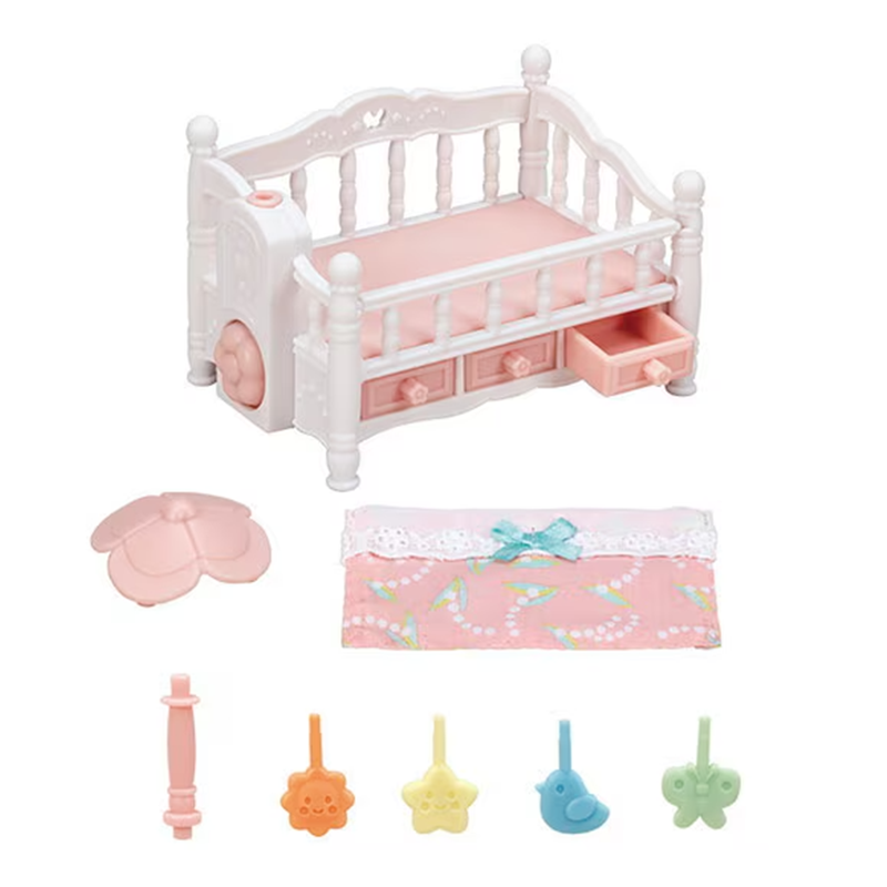 Time to tuck in those tiny Calico Critters! The adorable Calico Critters Crib with Mobile transforms any dollhouse nursery into a cozy sleep sanctuary. The charming white crib features sweet pink polka dot bedding, perfectly sized to cradle, twin, or baby Calico Critters. Spin the flower dial to set the mobile twirling and watch those little ones drift off to dreamland!