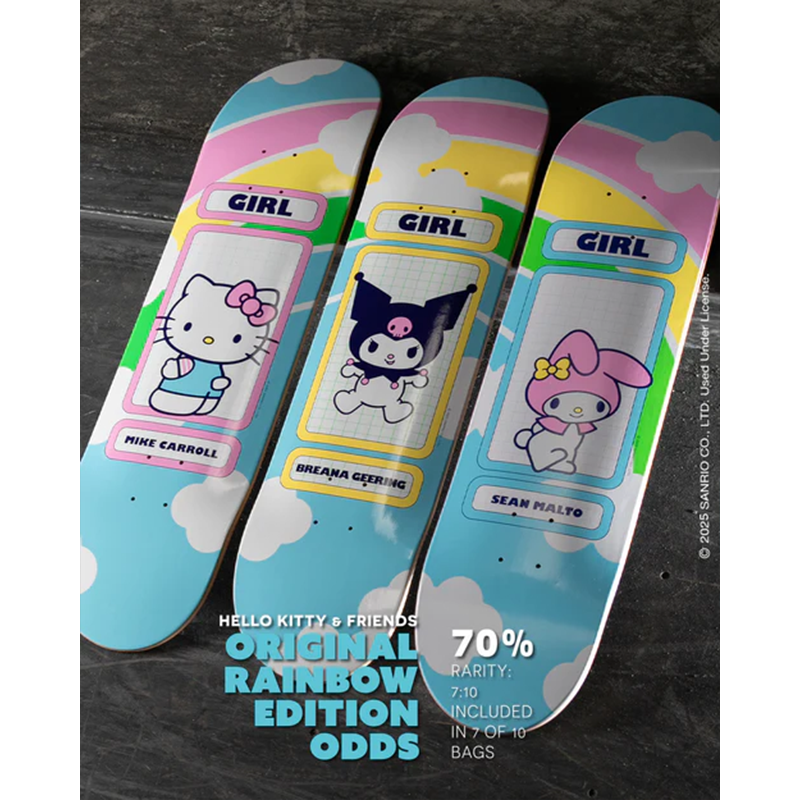 Experience the new Hello Kitty and Friends x GIRL Rainbow Deck Blind Bag, showcasing a lively rainbow design. It's a surprise which color way you will get! Each deck comes packaged in a blind bag, adding an exciting surprise element with three different variations available per character. This playful collaboration brings fresh, colorful energy to your skate collection while delivering the quality you trust from GIRL Skateboards. Collect them all and show off your style!