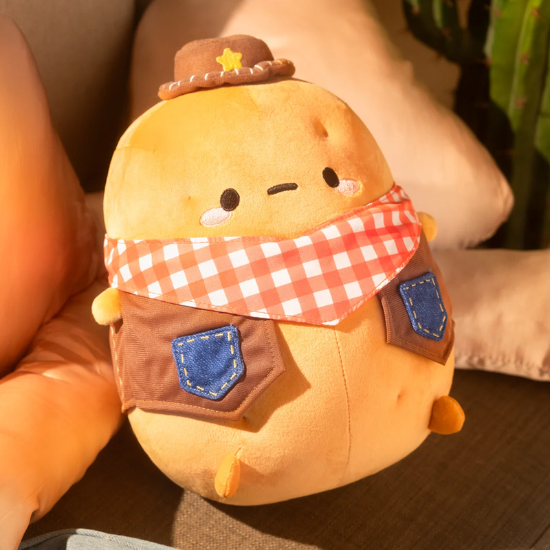Howdy, partner! The Tayto Potato Gingham Cowboy Midi Mochi Plush is here to lasso some fun into your life! This rootin'-tootin' mochi plush is not just any potato; he's a certified cowboy ready to ride the range of cuddles and adventure! With his stylish gingham print, Tayto is the perfect sidekick for all your wild west dreams. Whether he's keeping watch on your desk or joining you for naptime on the couch, this squishy spud brings western charm and huggable softness wherever he goes. Saddle up with Tayto and let the cuddly adventures begin!